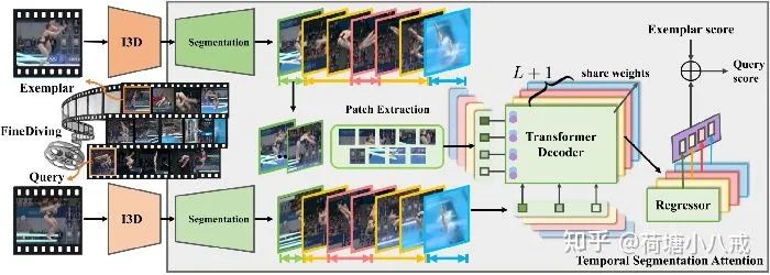 我们进一步提出一种过程感知方法来评估动作质量,通过构建一个新的时间分割注意模块(Temporal Segmentation Attention,TSA),以可解释的方式评估动作得分。TSA包含三个部分:动作过程分割(procedure segmentation),过程感知交叉注意(procedure-aware cross-attention)以及细粒度对比回归(fine-grained contrastive regression)。首先,动作过程分割将成对的查询动作实例和参考动作实例解析为语义和时间对齐的连续步骤。其次,过程感知交叉注意通过学习发现成对query step和exemplar step之间的时空对应关系,并在这两个步骤中生成新特征。成对的步骤相互补充,以引导模型关注exemplar step和query step中的一致区域,其中,exemplar step保留了特征图的空间信息。最后,细粒度对比回归通过学习成对步骤的相对分数来量化查询动作实例和示例动作实例之间的一些列步骤偏差,以指导模型来评估动作质量。