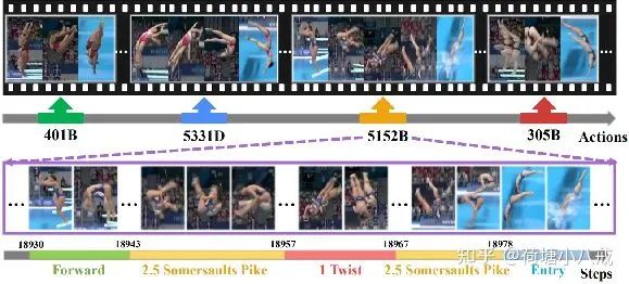 我们构建了一个两层语义结构(如图(2)),作为字典来标注动作级标签和步骤级标签。动作级标签(action-level labels)描述了运动员的动作类型(action types),步骤级标签(step-level labels)刻画了动作过程中连续步骤的子动作类型(sub-action types),其中,每个动作过程中的相邻步骤(steps)属于不同的sub-action types。例如,action type“5255B”,由sub-action types分别为“Back”、“2.5 Somersaults Pike”以及“2.5 Twists”的steps按顺序执行。此外,我们构建了一个两层时间结构(如图(3)),action-level labels标注了每个运动员执行一个完整动作实例的时间边界(在此注释过程中,丢弃所有不完整的动作实例并过滤掉慢速播放)。Step-level labels标注了动作过程中连续步骤的起始帧。例如,action type为“5152B”的动作实例,它的连续步骤的起始帧分别为18930、18943、18957、18967和18978。