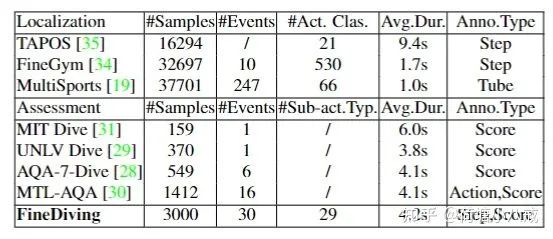 根据表(5)可知,FineDiving在注释类型和数据规模上不同于现有的AQA数据集:MIT-Dive、UNLV以及AQA-7-Dive数据集仅提供动作分数,MTL-AQA提供粗粒度注释(即动作类型和时间边界),而FineDiving提供了细粒度注释(包括动作类型、子动作类型、粗粒度和细粒度时间边界以及动作分数)。此外,由于缺乏动作得分,其他细粒度的运动数据集不能用于评估动作质量。不难发现,FineDiving作为第一个用于AQA任务的细粒度运动视频数据集,填补了AQA中细粒度注释的空白。