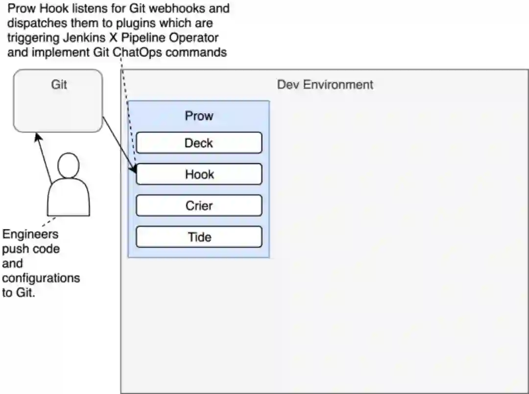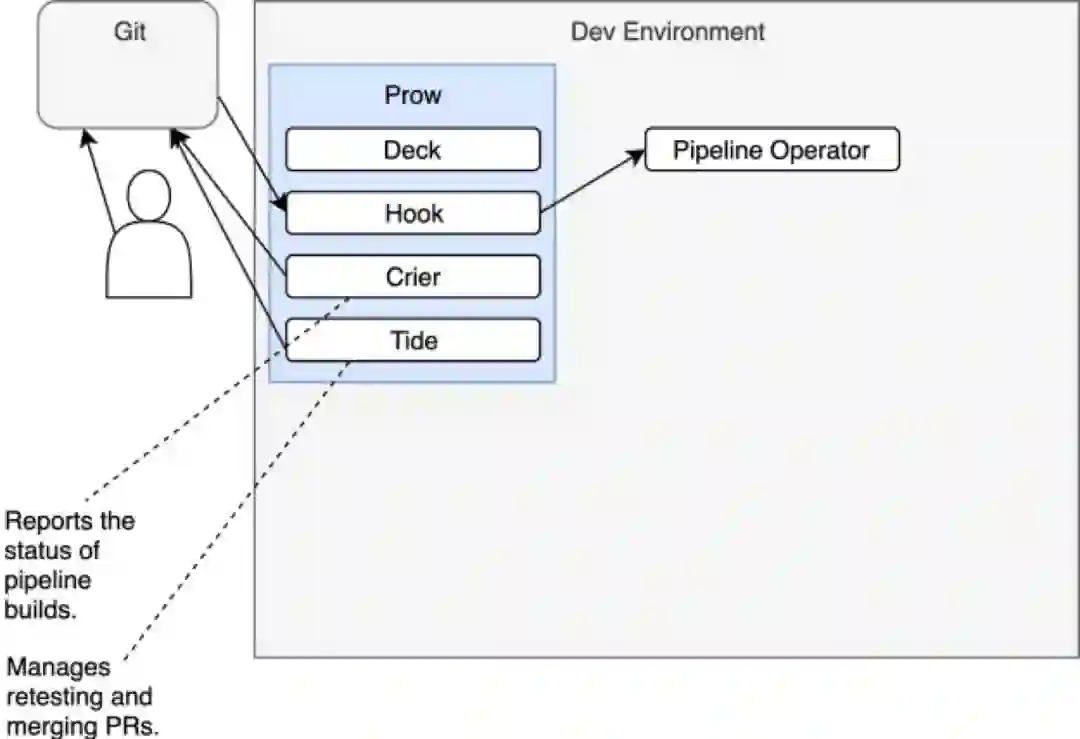 Prow由几个不同的组件组成(例如,Deck,Hook,Crier,Tide等等)。然而,我们并不会深入介绍各个组件的职责。此刻,最需要留意的重要事项是Prow是群集的入口。它接收所有的Git请求,包含产生于Git动作的(例如push)与产生于评论中斜杠命令的。