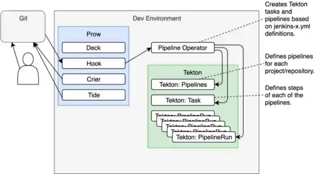 当Prow Hook收到来自Git webhook的请求时,它会将其转发给Jenkins X Pipeline Operator。Operator的职责是从库中取回用于初始化流程的jenkins-x.yml文件,并将其转换为Tekton Tasks和Pipelines。反过来,它们定义了将变更push到Git后,应该被执行的完整流水线。