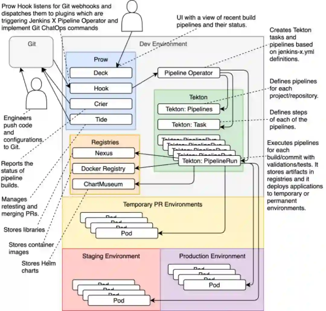 Tekton为每次推送创建一个PipelineRun,每次推送都发送到一个相关的分支(例如,master分支,PR等),同时执行验证推送所需的所有步骤。Tekton运行测试,在注册表中存储二进制文件(例如,Docker Registry,Nexus和ChartMuseum),并将发布部署到临时(PR)或永久(临时或生产)环境。
