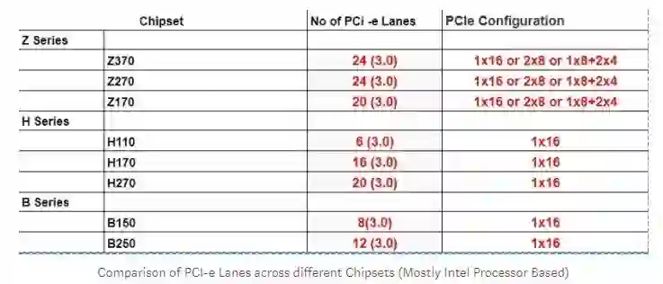 下表给出了在不同芯片组下可用 PCIe 通道的个数: