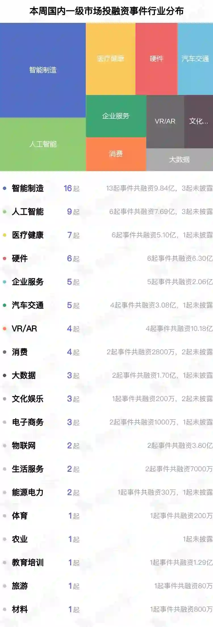 本周智能制造、人工智能、医疗健康领域融资最活跃
