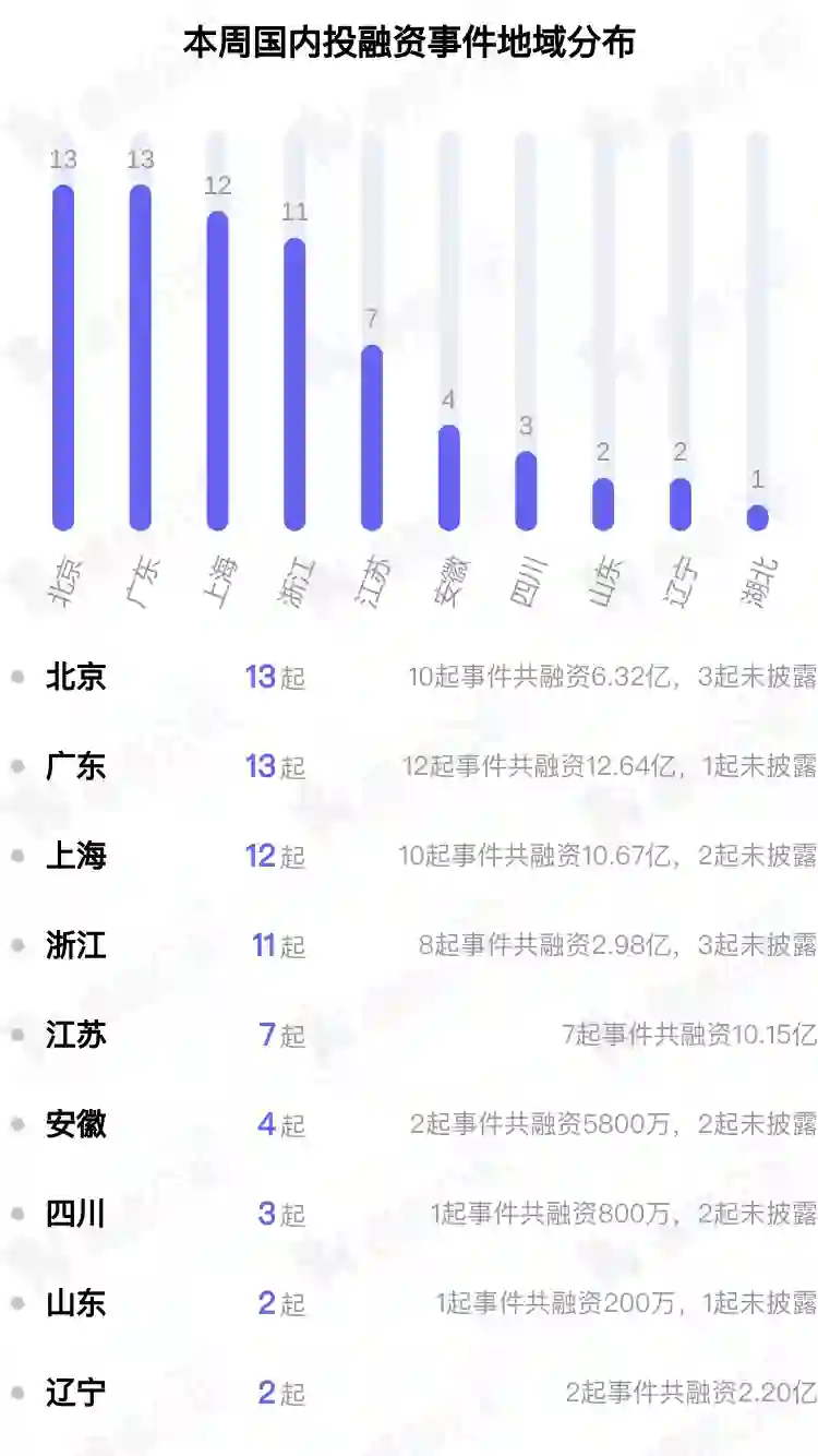 从本周披露获投企业的地域分布来看,主要集中在北京、广东、上海。