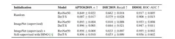 首先将Deit-S与具有随机初始化权重的ResNet50进行比较(Kaiming初始化)。上表中的结果表明,在这种设置下,CNN在所有方面都远远超过ViTs。这些结果与之前在自然图像领域的观察结果一致,在自然图像领域,在有限数据上训练的ViTs表现优于类似大小的CNN,这一趋势被归因于ViT缺乏归纳偏差。由于大多数医学成像数据集的大小适中,随机初始化的ViTs的用处似乎是有限的。