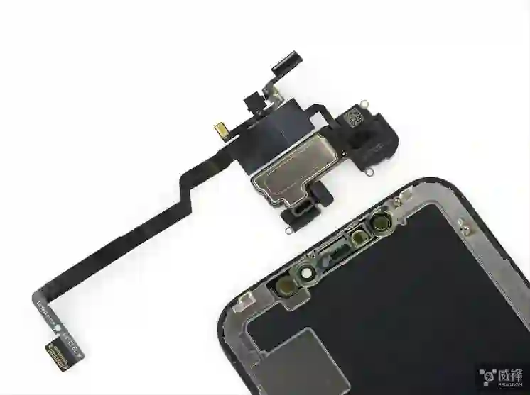 将组件拆卸下来之后,我们可以看到扬声器、麦克风、环境光传感器、泛光照明器和近距离传感器。