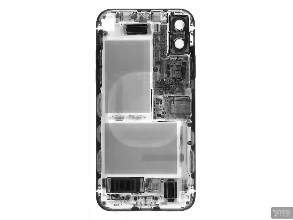上图再一次证实了之前 X 光扫描时看到的布局:双电池和较小的逻辑板
