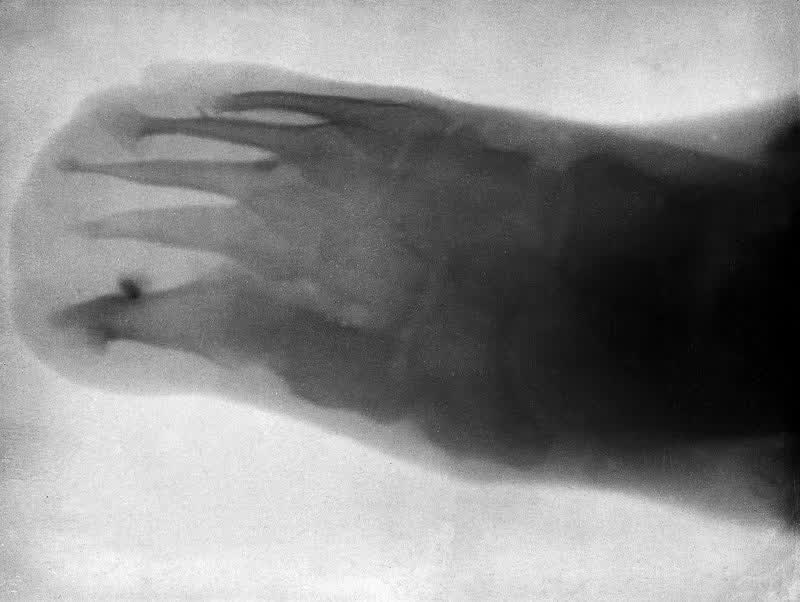 一只骨折愈合后的青蛙(后腿较厚的部位在顶部)——由亚瑟·舒斯特于1896年拍摄的X光照片