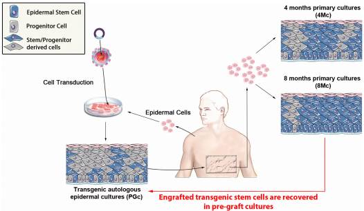 过去对两名患者的治疗证明,移植转基因表皮培养物(基因改造的表皮细胞群)能够生产功能正常的表皮,修复交界性大疱性表皮松解症的皮肤损害。但是,这只能重建小面积范围内的皮肤。