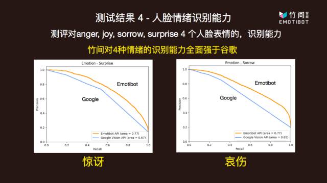 竹间智能以香港中文大学发布的 Expression in- the-Wild (ExpW) Dataset 作为测试集,将自己的情绪识别 API Emoti-Face 与谷歌云提供的也有情绪识别功能的 Google cloud vision API 进行了对比,并在共有的开心、生气、哀伤和惊讶四个维度上,取得了优异于谷歌的准确率和识别能力。
