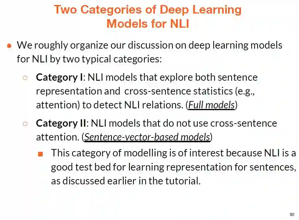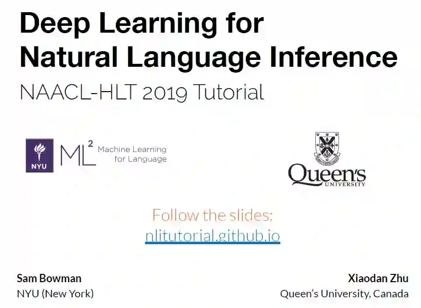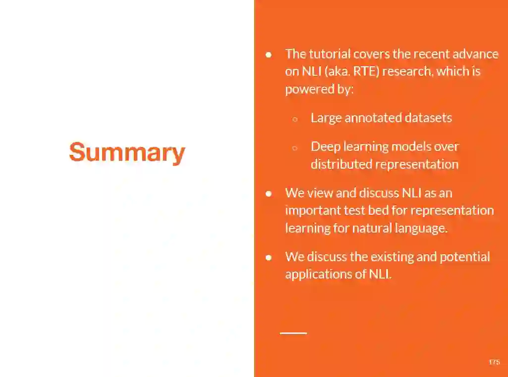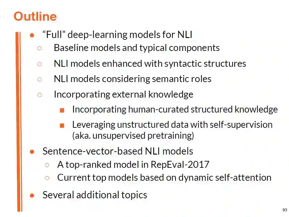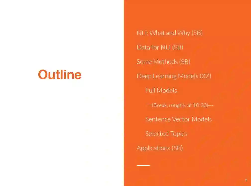 本教程讨论关于NLI的前沿研究,包括数据集开发的最新进展、前沿的深度学习模型,以及最近关于使用NLI理解语言理解和推理的深度学习模型的能力和限制的研究重点。