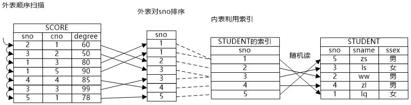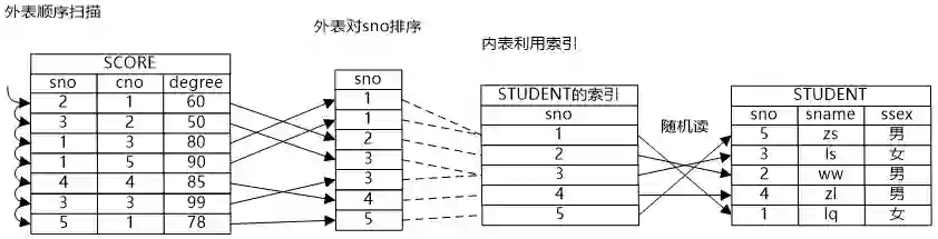 牛二哥继续说:“如果将两个表先排序,那么就可以引入第三种连接方式,Merge Join。这种连接方式的代价主要浪费在排序上,如果两个关系的数据量都比较小,那么排序的代价是可控的,MergeJoin就是适用的。另外如果关系上有有序的索引,那就可以不用单独排序了,这样也比较适用于MergeJoin。你看我画的这个归并连接的示意图,外表是需要排序的,而内表则借用了原有的索引的顺序,消除了排序的时间,降低了物理路径的代价。”