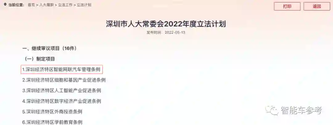 根据深圳人大常委会发布的2022年立法计划,《深圳经济特区智能网联汽车管理条例》赫然排在第一位,而且管理条例已经过了发布前的三审阶段,正式出台,只差临门一脚。