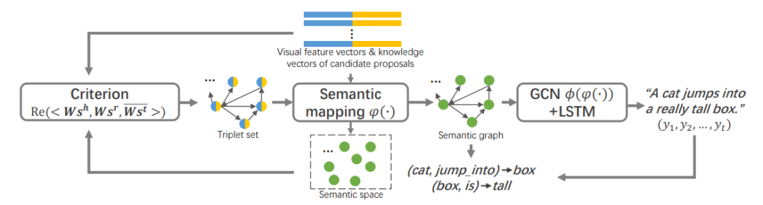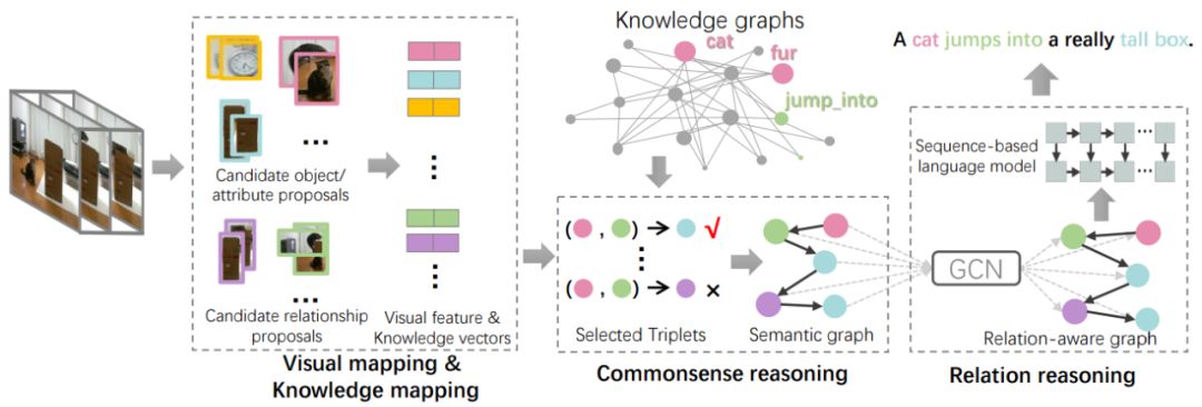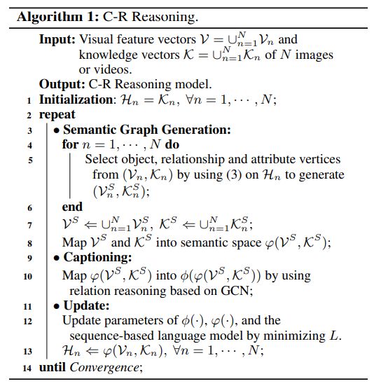 ,该方法利用先验知识进行图像和视频描述,而无需依赖任何目标检测器。先验知识提供对象之间的语义关系和约束,作为指导以建立概括对象关系的语义图,其中一些对象之间的关系是不能直接从图像或视频中获得。特别是,本文的方法是通过常识推理和关系推理的迭代学习算法交替实现的,常识推理将视觉区域嵌入语义空间以构建语义图,关系推理用于编码语义图以生成句子。作者在几个基准数据集上的实验验证了该方法的有效性。