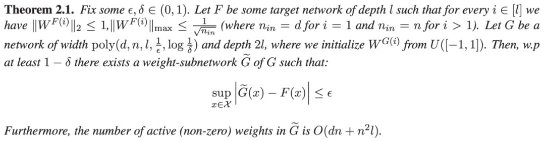 (正如 Ramanujan 等人在 2019 年所猜想的那样),即对于每个有界分布和每个带有有界权重的目标网络来说,一个具有随机权重的充分过参数化神经网络包含一个具有与目标网络几乎相同准确率的子网络,并且无需任何进一步的训练。