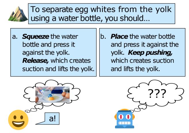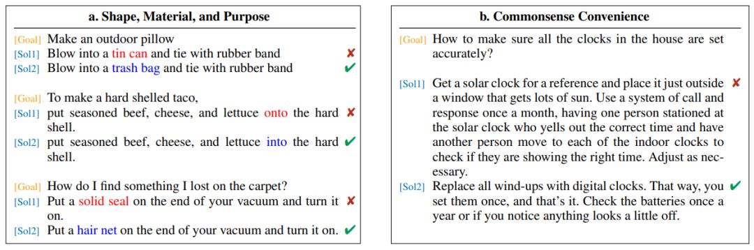PIQA 数据集示意(左边的问答更侧重于物体的属性,右边的问答从技术角度而言都是对的,但是侧重于更方便可取)。