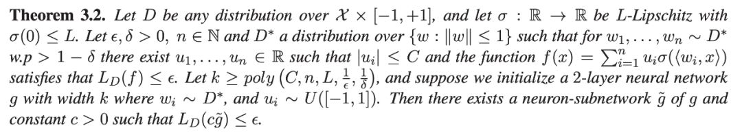 定理 3.2 表示,对于任意数据分布,如果随机特征模型能实现非常小的损失值,那么它就能找到一个剪枝神经元的子网络(neuron-subnetwork),并实现相同的损失。