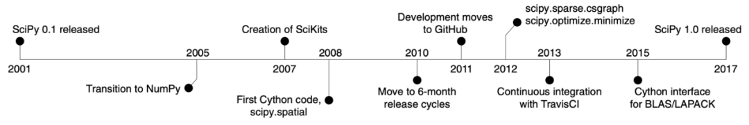 自 2001 年发布 0.1 版本到 2017 年推出 1.0 版本,SciPy 发展过程中的一些里程碑式事件。