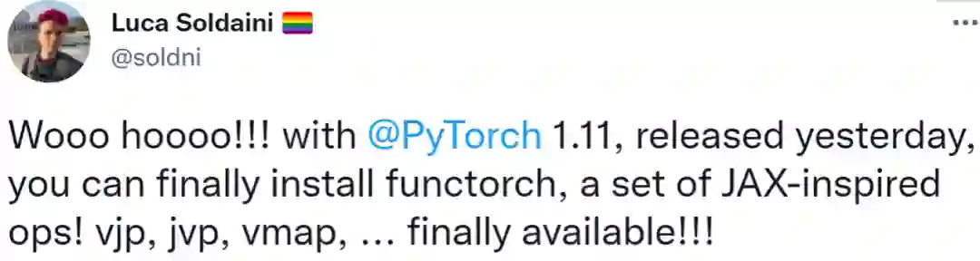 网友也不禁感叹:终于可以安装 functorch,一套受 JAX 启发的 ops!vjp、 jvp、 vmap... 终于可用了!!!