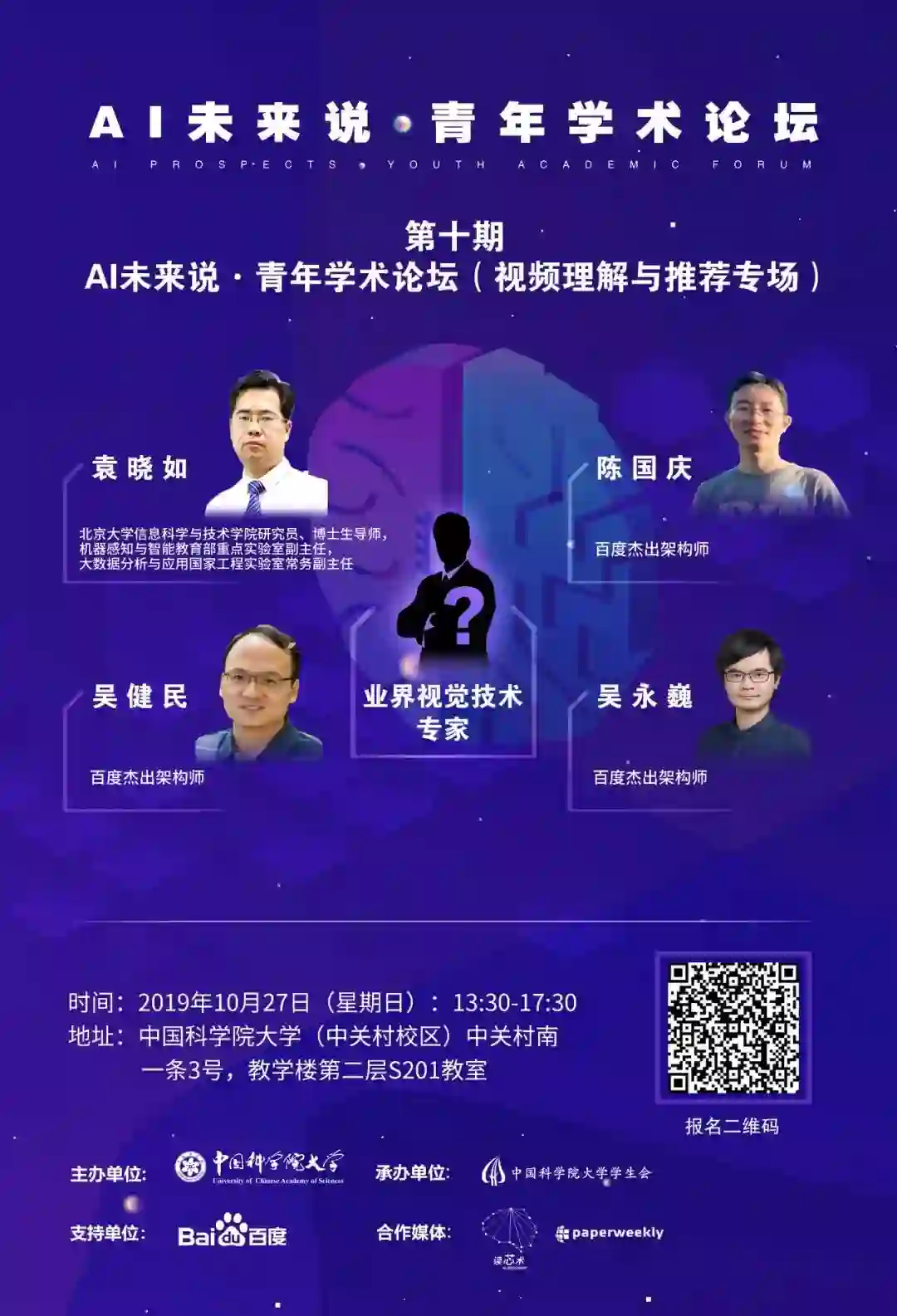 “AI未来说·青年学术论坛”系列讲座由中国科学院大学主办,承办单位为中国科学院大学学生会,协办单位为中国科学院计算所研究生会、网络中心研究生会、人工智能学院学生会、化学工程学院学生会、公共政策与管理学院学生会、微电子学院学生会、数学与系统科学研究院研究生会,百度为支持单位,读芯术、PaperWeekly为合作自媒体。“AI未来说·青年学术论坛”第十期将于2019年10月27日下午13:30-17:30在中国科学院大学(中关村校区)中关村南一条3号教学楼第二层S201举行。