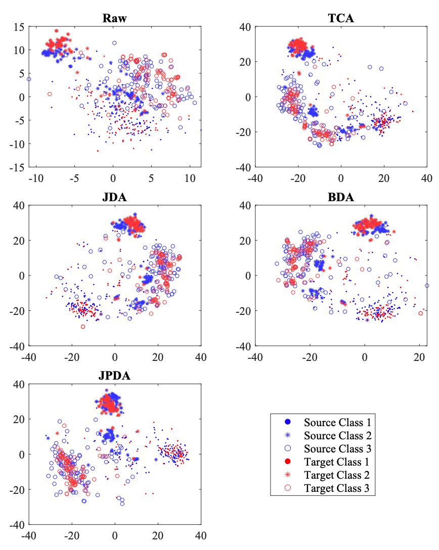 t-SNE 数据分布图中,Raw 表示原始数据分布。对于原始分布,来自源域和目标域的类 1 和类 3(也有一些来自类 2)的样本混合在一起。在 DA 之后,JPDA 将源域和目标域的数据分布放在一起,并将来自不同类的样本很好地分隔开。