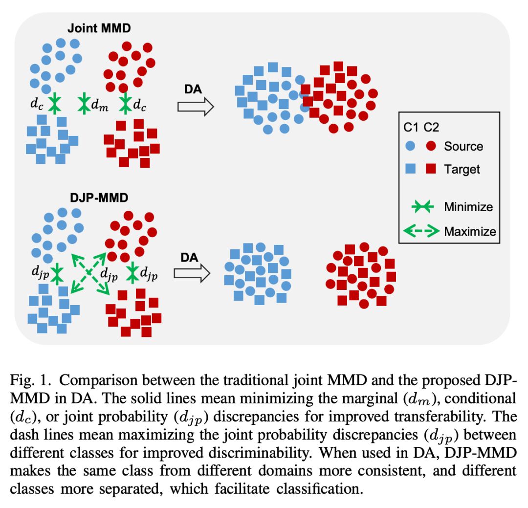 本文提出了一种简单而有效的 DJP-MMD 方法。通过最小化源域和目标域(即,提高域可转移性),最大限度地提高不同类的联合概率 MMD(即,增加类的辨别力)。
