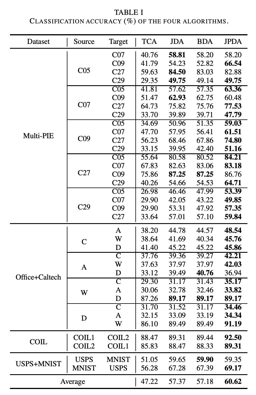 为了评估本文方法的性能,作者在 Offifice+Caltech 、COIL 、Multi-PIE 、USPS 、MNIST 数据集进行了实验,将所提出的 JPDA 与三种无监督 DA 方法(TCA、JDA和BDA)进行比较 。实验结果与 t-SNE 数据分布结果如下图。