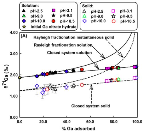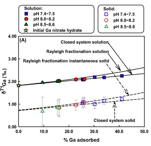 吸附过程对于充分了解金属离子在水岩作用、生物吸收以及大陆风化作用中的迁移转化及机理起着至关重要的作用。Mo、Ge 和 Zn 等多种金属已被证明在矿物吸附过程中会产生显著的同位素分馏。据此,中国科学院地球化学研究所研究员陈玖斌课题组利用在2016年新建的高精度 Ga 同位素分析方法的基础上,开展了 Ga 在矿物表面吸附过程中的同位素分馏研究。研究选取作为地球表层普遍存在并是微量元素迁移的重要载体方解石和针铁矿两类矿物。结果表明,较轻的 Ga 同位素(69Ga)会被优先吸附到矿物(方解石和针铁矿)表面,且方解石表面吸附过程中的同位素分馏大于针铁矿表面吸附过程,其 △71Gasolid-solution 分别为-1.27‰和-0.89‰。造成分馏的主要原因是 Ga 从水溶液吸附到矿物表面发生了形态转变(共价键数和键长),水体中 Ga(OH)4– 会优先吸附到方解石和针铁矿表面分别形成 >Ca-O-GaOH(OH2)4+ 和 >FeOGa(OH) 20 ,从而使共价键由4转变为6,且 Ga-O 键长变长,分别从水体中的1.84 Å 增加到1.94 Å 与1.96 Å 。研究结果表明,有机物吸附过程也会产生类似的 Ga 同位素分馏,预示着 Ga 同位素可以用于示踪生物地球化学过程。特别是在低比值的水/碳酸盐岩与水/铁(氢)氧化物的表层环境下,水体较颗粒物而言可能富集重的 Ga 同位素(71Ga)。作为新开发的同位素体系, Ga 在地学各领域研究中有着重要应用前景。