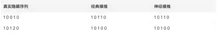 注意,我们这里使用的神经网络没有编码任何关于经典消息传递的规则,并且绝对没有编码任何HMM内部的生成过程。然而在两种情形下,神经网络都成功取得了和结构相同的经典消息传递过程一样好(但没有更好)的精确度。实际上,该神经训练过程相当于一段代码,这段代码和前向-后向算法做出一致的预测,却对前向-后向算法毫无所知!