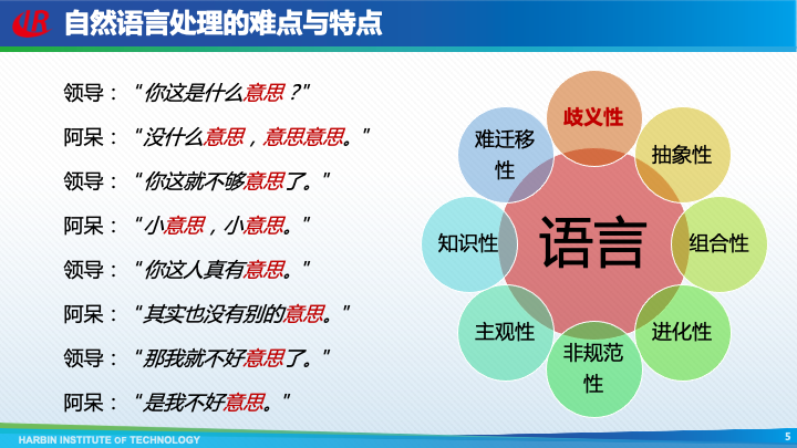 那么,自然语言处理到底难在哪呢?我们通过一个例子来看一下,这是领导和阿呆的对话,其中有很多的“意思”,它们又有很多不同的意思。这体现了自然语言具有非常严重的歧义性的特点,除了歧义性外,自然语言还具有抽象性、组合性、进化性、非规范性等八个主要特点。