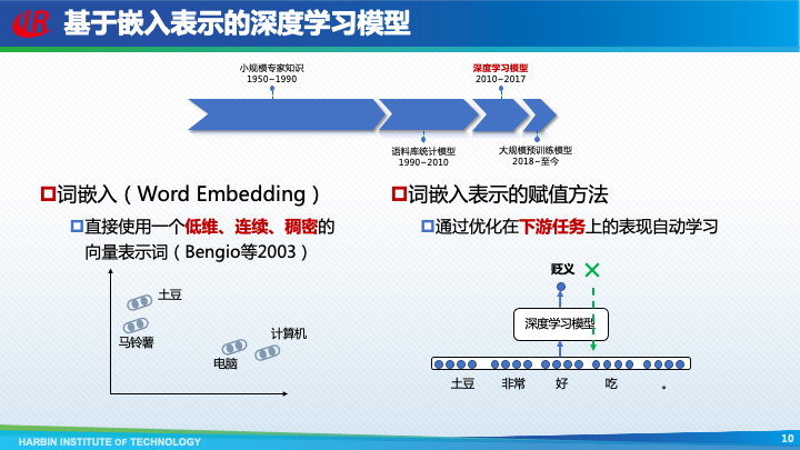 2010年左右,自然语言处理逐渐开始采用深度学习模型,其特点是使用嵌入表示来表示语义。图灵奖得主Bengio于2003年首次提出了词嵌入(Word Embedding)的概念,即直接使用一个低维、稠密、连续的向量表示词。这样,语义上相近的两个词,它们嵌入表示的距离也比较近。