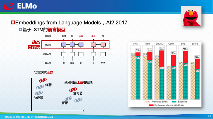 为了解决上述问题,AI2于2018年提出了ELMo(Embeddings from Language Models)模型,其核心思想是使用语言模型的输出作为词向量,该表示是上下文相关的,也叫做动态词嵌入表示。如在句子”我喜欢吃土豆“中,”土豆“的表示应该和”马铃薯“相似;而在句子”我在土豆上看电影“中,”土豆“的表示则应该和”爱奇艺“相似。将ELMo输出的词向量作为特征,极大提高了多种下游任务的性能。