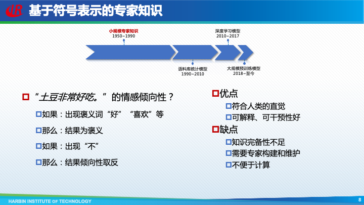 自然语言处理发展的前40年,利用的是基于符号表示的小规模专家知识,也就是通过人工定义的规则以及语言知识库,来解决一些简单的自然语言处理问题。这种方法的优点是符合人类的直觉,并且具有良好的可解释和可干预性。但是缺点也非常明显,首先是知识完备性不足,无法覆盖很多的长尾语言现象;其次是需要大量的专家来构建和维护规则和知识库;最后就是非常不便于计算。