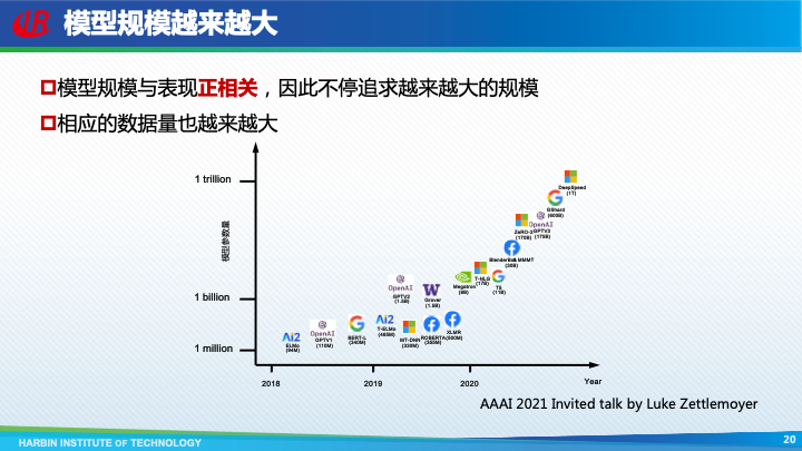 随着研究的逐渐深入,人们意识到模型规模与模型表现之间具有非常强的正相关性,因此预训练模型变得越来越大,各大厂商俨然开始了一场军备竞赛。