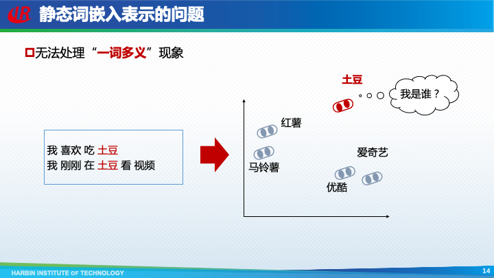 虽然可以处理”多词一义“现象,但是静态词嵌入表示本身仍然存在一个致命的固有缺陷,即无法处理”一词多义“现象。因为词嵌入的一个基本假设是每一个词对应唯一一个词嵌入表示。这样,如果一个词有多种词义,那么用哪个词义的向量来表示这个词呢?仍然以”土豆“这个词为例,它即是一种蔬菜,此时应该和”马铃薯“等词的表示相似;同时也是一个视频网站,此时又应该和”爱奇艺“等词的表示相似,那么最终”土豆“的词嵌入表示必将是个”四不像“。