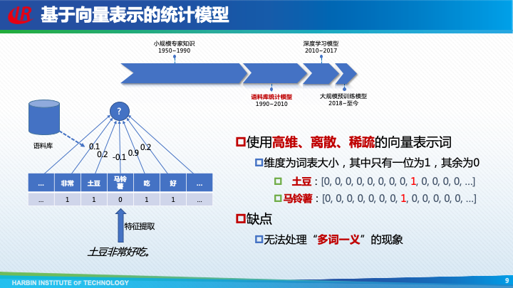 于是,从上世纪90年代初,自然语言处理全面转向了基于语料库统计模型的范式。这一时期主要特点是使用提取特征的方式,将自然语言表示为高维、离散、稀疏的向量,然后对向量中的数值进行加权求和,结果作为最终判断的依据。其中权重是通过对语料库的统计获得的。