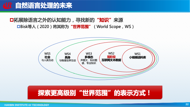 为了未来真正实现自然语言处理,一定要拓展除语言之外的认知能力,寻找新的“知识”来源。Bisk等人(2020)将其称为“世界范围”(World Scope,WS),并划分了五个级别。