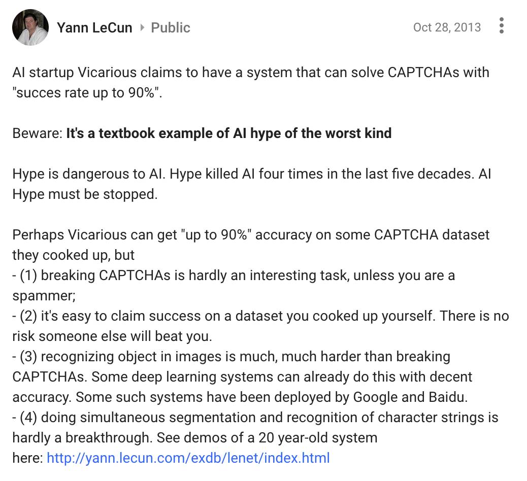 当 2013 年 Vicarious AI 公布结果时,业界褒贬不一,Vicarious AI 没有拿出有效的研究方法是很多 A.I. 科学家口诛笔伐的主要理由,其中也包括了 LeCun。他在 2013 年对 Vicarious AI 进行了激烈的抨击,并用「这是最糟糕的教科书式的 AI 炒作案例(It is a text example of AI hype of the worst kind)」来谴责 Vicarious AI。