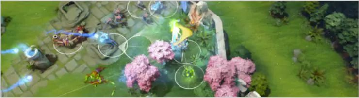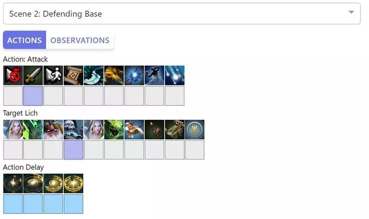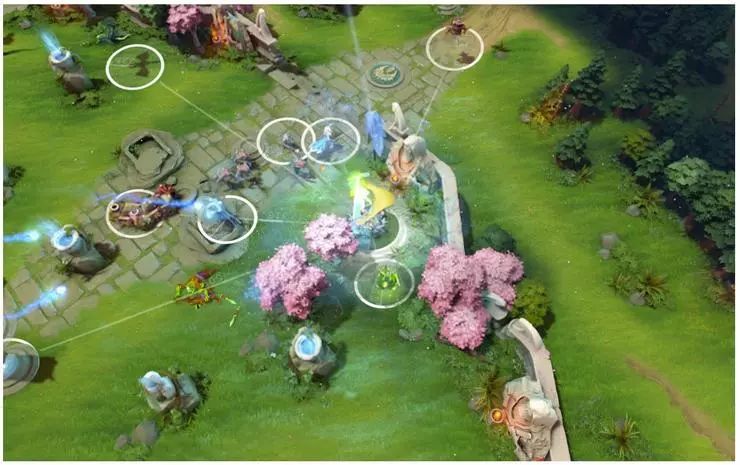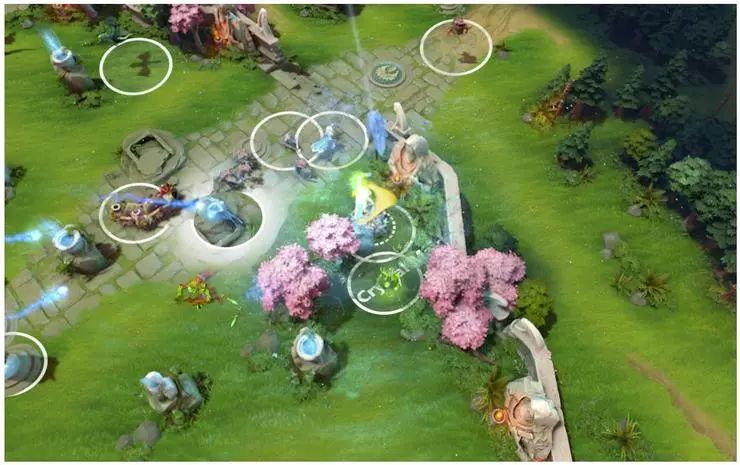 Dota 2 中大概有 170,000 个不同的动作,包括正常的动作,如移动和攻击,还包括技能施放、物品使用、状态升级等。在每个时间点上并非所有操作都可以使用——比如可能还没有学这个技能,或者背包里没有这个装备。但你仍然可以使用大约 1000 种不同的操作。此外,许多动作都有参数,例如你想要移动到什么区域或你想要攻击哪个敌人。OpenAI在博文中也展示了很好的动作空间的可视化。