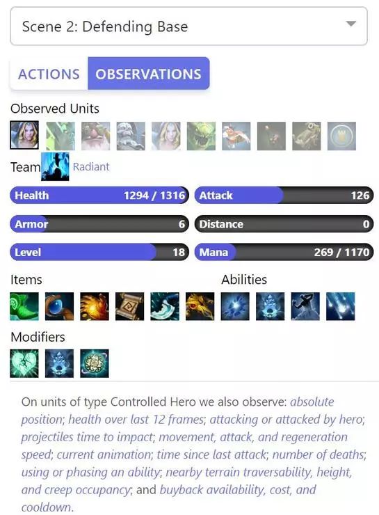 OpenAI Five 的 AI 使用 Dota 2 的 API 来「看到」周围的单位和建筑物。这会产生可变长度的单位列表(英雄,小兵,塔等)及其属性。OpenAI 在他们的博客文章中对观测空间和动作空间可视化做的很好,我建议大家去原博客里感受一下 https://blog.openai.com/openai-five/#dota-diagram 。