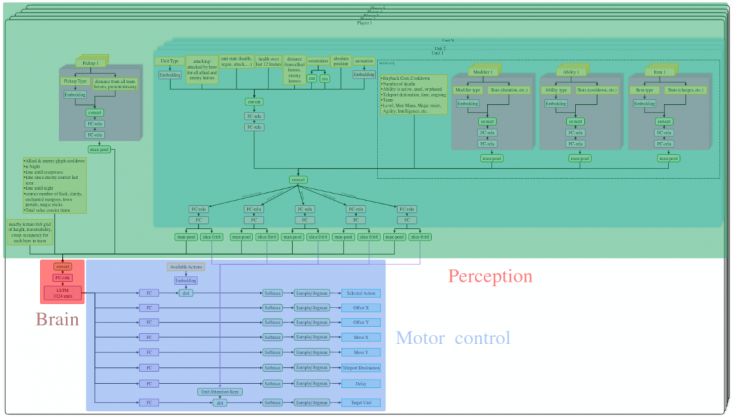 在分析 OpenAI Five 网络之后,很明显网络的大多数部分都在处理感知(观察预处理)和运动控制(解码动作)任务。而所有战略和策略必须由同一个地方产生——即 1024 个神经元的 LSTM。