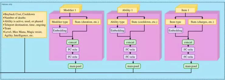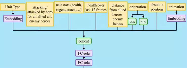 以上处理是针对每个相邻的单位独立完成的,一般属性、英雄天赋、技能和物品的结果都会连接在一起。然后应用不同的后处理,根据它是敌方非英雄(如敌方塔)、友方非英雄(己方塔)、中立(野怪)、友方英雄或者敌方英雄。