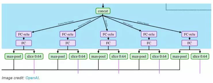 虽然关于 OpenAI 的 AI 的举止以及关于这些比赛对于整个 AI 界的意义的讨论已经不少了,但关于这些 AI 的训练方法和网络架构的技术分析异常地少。到目前为止,技术分析主要都源于最初 OpenAI Five 的博客文章。在某种程度上他们确实说得挺合理,他们使用标准 PPO 算法(几年前他们自己发明的)和经过验证确实有效的自我训练方案(也在他们的论文 https://arxiv.org/abs/1710.03748 中记录)是合理的。但博客文章中有一个容易错过的细节,那就是指向他们的网络架构图的一个超链接。