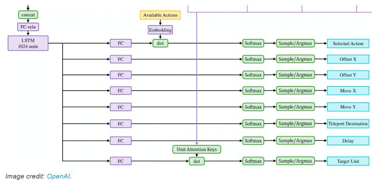 我最喜欢的部分是 OpenAI Five 如何处理目标。还记得那些来自单位观测输出的奇怪切片吗?这些在图上用蓝色表示,这意味着它们是对每个单位都有一个单独的切片。这些向量称为「单元注意键」,并与 LSTM「意图」匹配,以产生对于每个单位的分数。这些分数通过 softmax 并确定攻击单位。选取被观察到的单位时再次使用了 softmax,从可用的动作的中选取动作的时候也是一样。