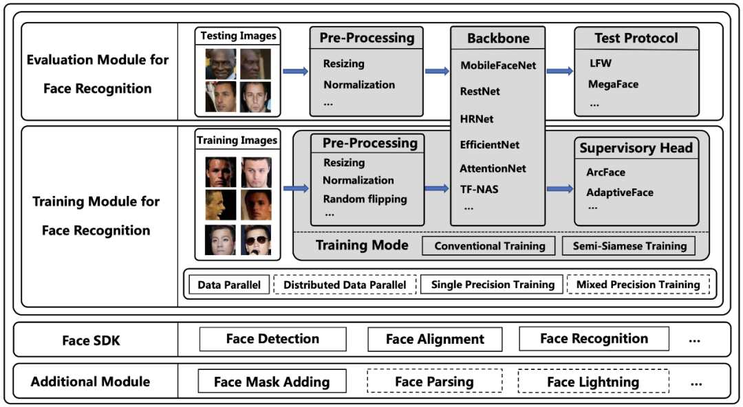 近年来,基于深度学习的人脸识别技术取得了重要进展。但是人脸识别模型的实际部署和深入研究都需要相应的公众支持。例如生产级人脸表示网络需要模块化的训练机制,以配合不同 SOTA 骨干网络、训练监督主题再到现实世界人脸识别需求。至于性能分析和比较,基于多个基准的大量模型也需要一个标准和自动化的评估工具。此外,人们希望能够出现一种以整体流水线形式部署的人脸识别公共基础。
