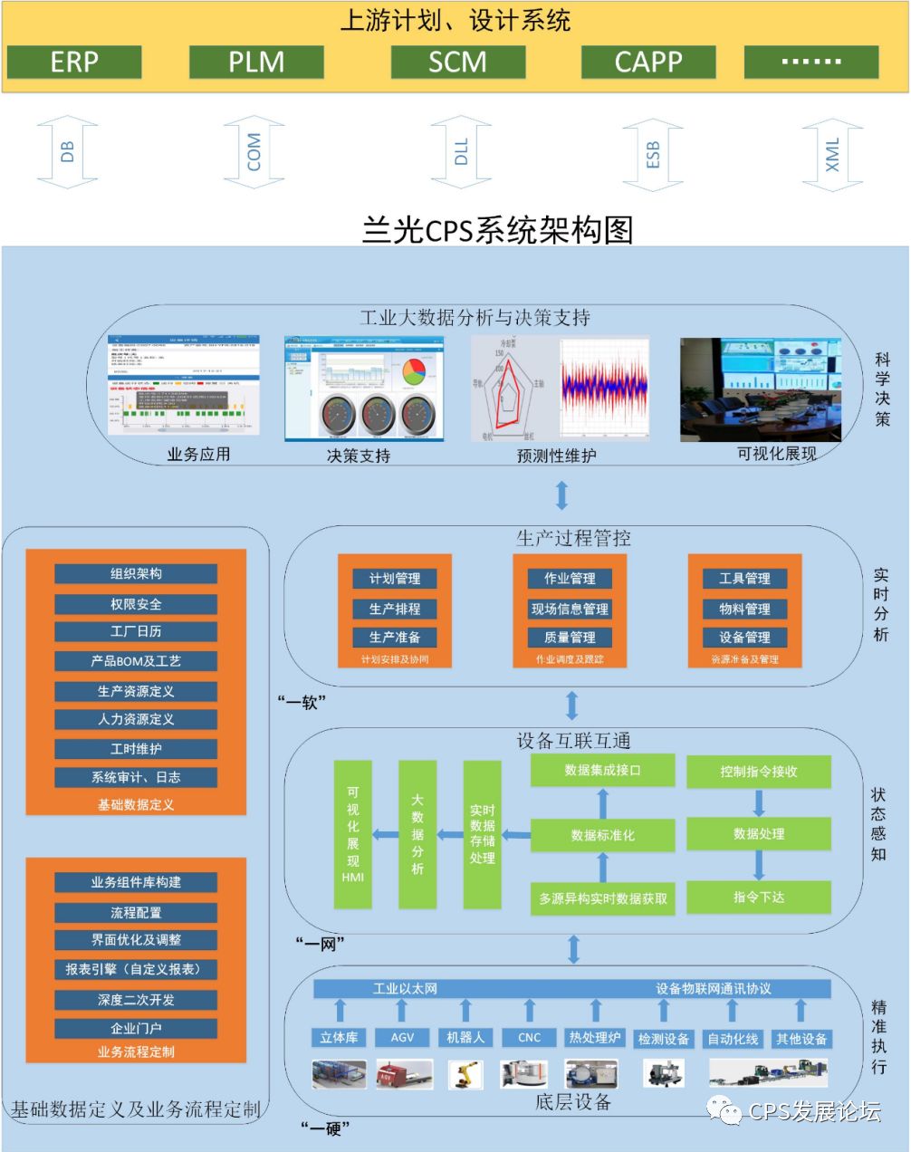 | 北京兰光创新科技有限公司的CPS解决方案是基于十多年数字化车间系统研发的基础上,借鉴工业4.0/智能制造、精益生产等先进理念,通过设备泛在连接与异构集成等先进技术,实现数据在生产设备、信息化系统之间的有序流动,体现状态感知、实时分析、科学决策、精准执行等特点的系统级CPS。该解决方案可提升企业生产过程的智能化、精细化、精益化管理水平,有效促进精益生产在企业的进一步落地。 | |||