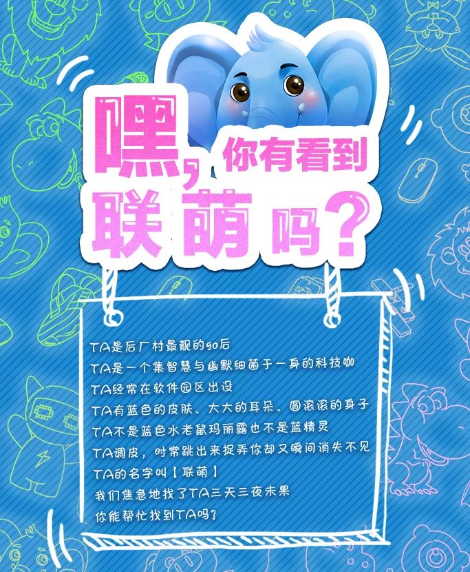 从8月初面向全球征集形象开始,到12月24日正式出道,联萌一直表现得之分活跃,它古灵精怪,官宣出道之前就自诩后厂村最靓少年,发起寻找联萌的活动,引得广大网友摩拳擦掌跃跃欲试: