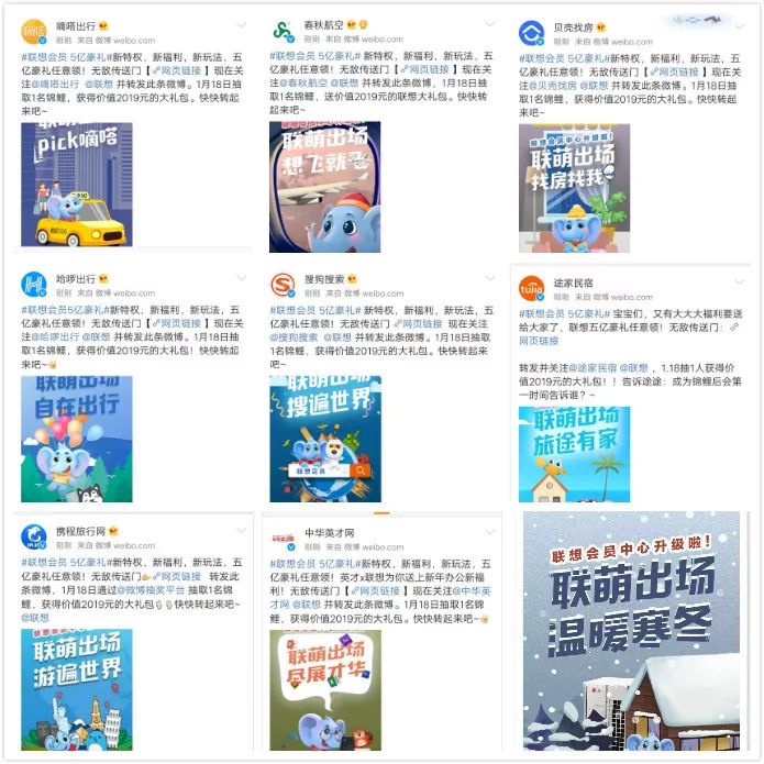 之后不久,联想会员中心重磅升级并伴有各种各样的福利,这样的好事儿联萌当然要奔走相告,已然小有人气的联萌又获得了9大品牌的友情助阵,携程、贝壳、途家、搜狗、春秋航空等9大品牌纷纷召唤自家吉祥物,与联萌合体一起为会员中心升级打call: