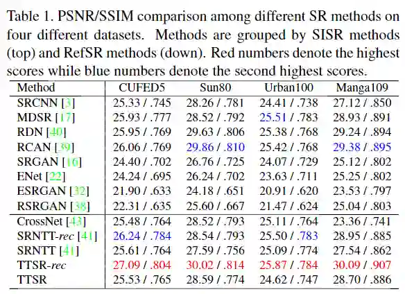 表1显示了定量评估结果。红色数字表示最高分,蓝色数字表示第二高分。如比较结果所示,TTSR在所有四个测试数据集上均明显优于最新的SISR方法和最新的RefSR方法。在Sun80和Manga109数据集上仍然具有最佳性能,在其他两个数据集CUFED5和Urban100上,TTSR模型可以达到与最新模型相当的性能。